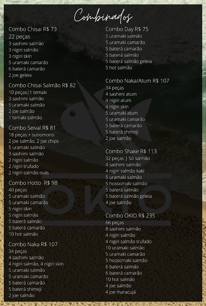 8 sashimi salmão, 4 nigiri salmão, 4 nigiri salmão trufado, 10 uramaki salmão, 5 uramaki camarão, 5 hossomaki salmão, 5 baterá salmão, 5 baterá camarão, 10 hot salmão, 4 joe salmão, 4 joe maracujá. Esse combinado oficial Okio, leva tudo o que tem de mais saboroso. Muita qualidade, muita variedade. Serve 3 pessoas.